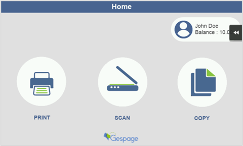 - Gespage home menu for quick access to core functions: PRINT, SCAN and COPY