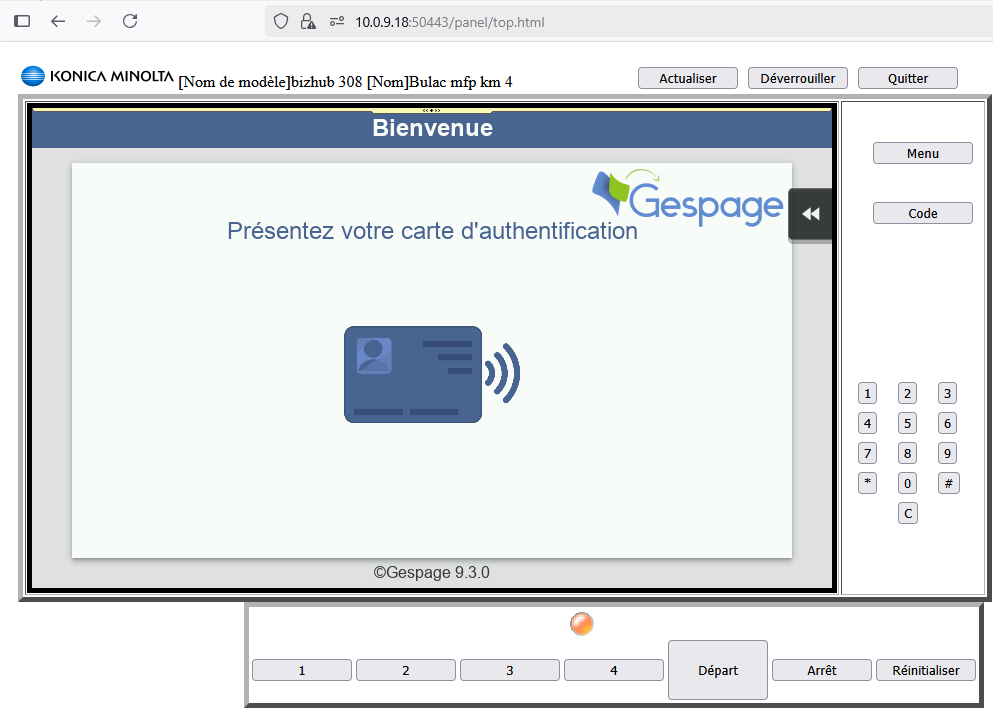 Open your browser and enter the following URL: https://MFP_IP_ADRESS:50443/panel/top.html