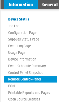 With HP devices, you can remotely access the control panel directly from the machine's web interface. Note that you must log in as an administrator to use this feature.