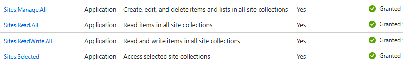 To be able to post in the organization's SharePoint site, the following permissions must be added to the Gespage app created on Azure: