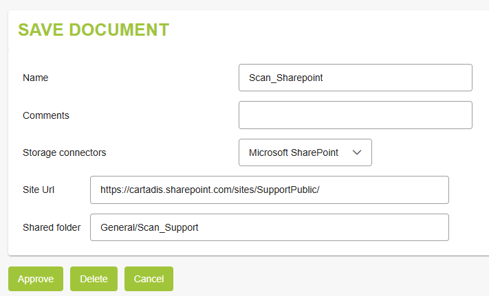 Select the SharePoint storage connector, then enter the information you retrieved earlier: