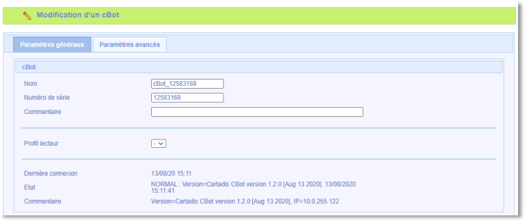 o Code-barres. Le type de lecteur souhaité doit être spécifié au moment de commander votre cBot. L'identifiant de la carte doit être connu du serveur, le cBot n'est pas en mesure d'associer une carte à un compte existant du serveur.