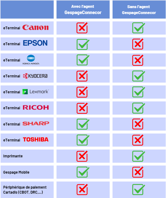 Le Connecteur Gespage est nécessaire pour les modules indiqués ci-dessous. Cela permet de fiabiliser les échanges entre ces périphériques et Gespage Stratus.