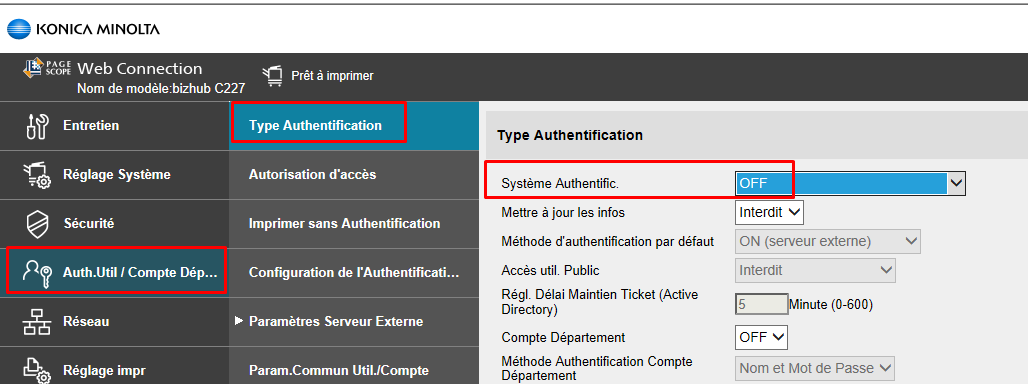 Il faut en premier lieu se connecter sur la page d'administration du copieur pour supprimer l'autentification via le serveur relai: