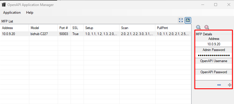 Ensuite, via l'utilisation de l'outil Konica Minolta OpenAPI Application Manager, ajouter votre matériel et connecter vous dessus en double cliquant sur l'adresse de votre copieur: