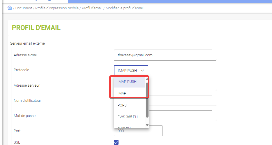Dans les profils de messagerie, plusieurs protocoles peuvent être configurés pour la récupération des courriels, le plus courant étant IMAP. Sur Gespage, deux modes opératoires pour le protocole IMAP sont disponibles :