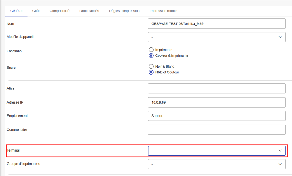 Imprimantes/Liste des imprimantes et on sélectionne l’imprimante concerné et on dissocie le terminal du copieur :