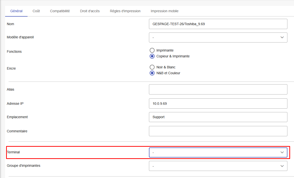 Imprimantes/Liste des imprimantes et on sélectionne l’imprimante concerné et on dissocie le terminal du copieur :