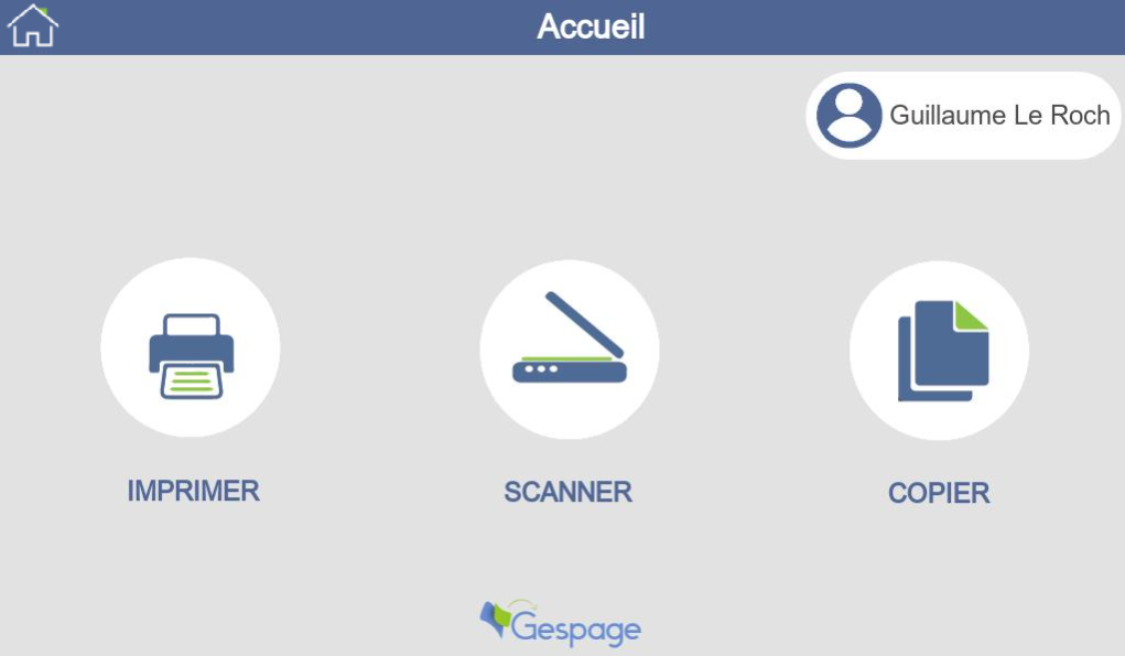 - Menu d'accueil Gespage pour un accès rapide aux fonctions principales : IMPRIMER, SCANNER et COPIER, ainsi qu’au menu d’ACCUEIL du MFP.